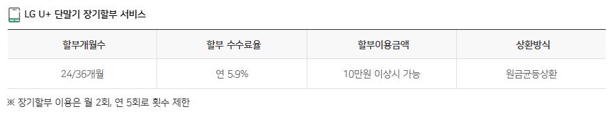 LGU+ 단말기 장기할부 서비스 이용은 월 2회, 연 5회로 횟수 제한이 있습니다.
