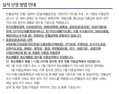 전월실적은 전월 1일부터 말일(매출승인일 기준)까지 카드별 국내외 가맹점 이용금액입니다.