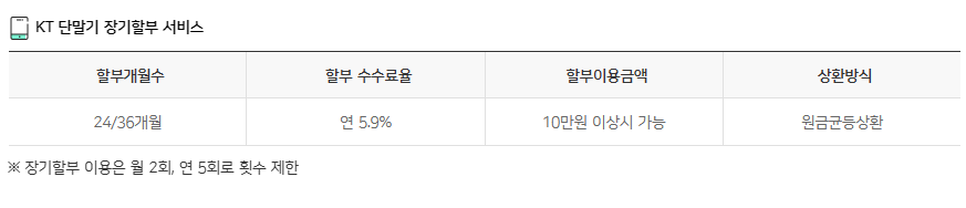 KT 단말기 장기할부 서비스 이용은 월 2회, 연 5회로 횟수 제한이 있습니다.